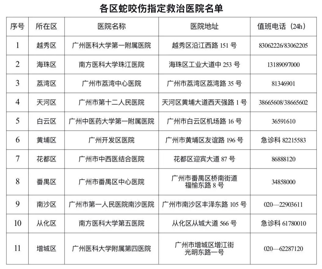 广州市11区均设有蛇咬伤定点救治医院。详见目录,可先致电咨询: